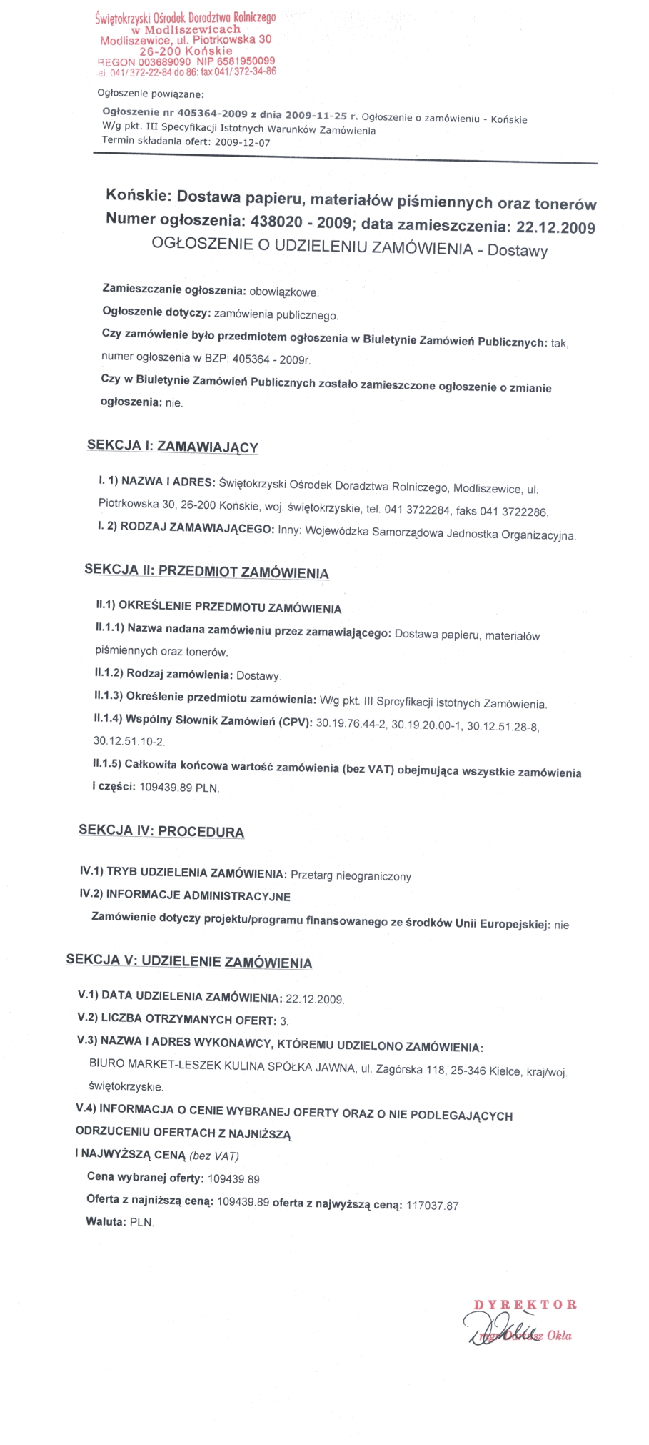 PRZETARG (TERMIN SKŁADANIA OFERT: 07.12.2009 godzina 08:00, miejsce: Świętokrzyski Ośrodek Doradztwa Rolniczego Modliszewice ul. Piotrkowska 30 pokój nr 13.) Dostawa papieru, materiałów piśmiennych oraz tonerów.