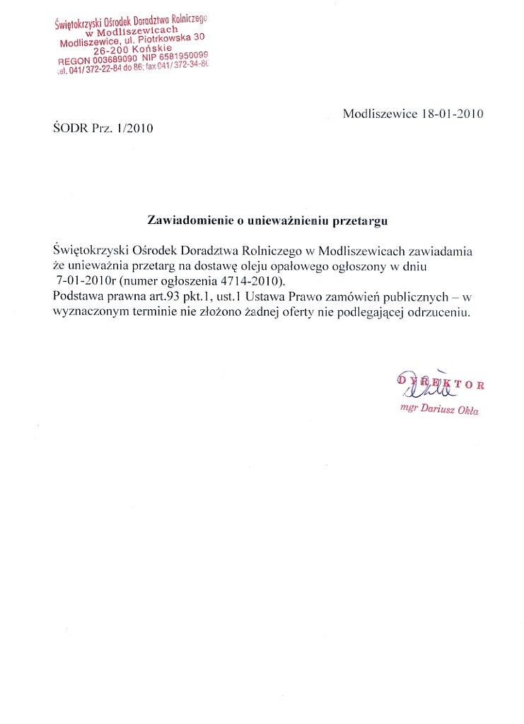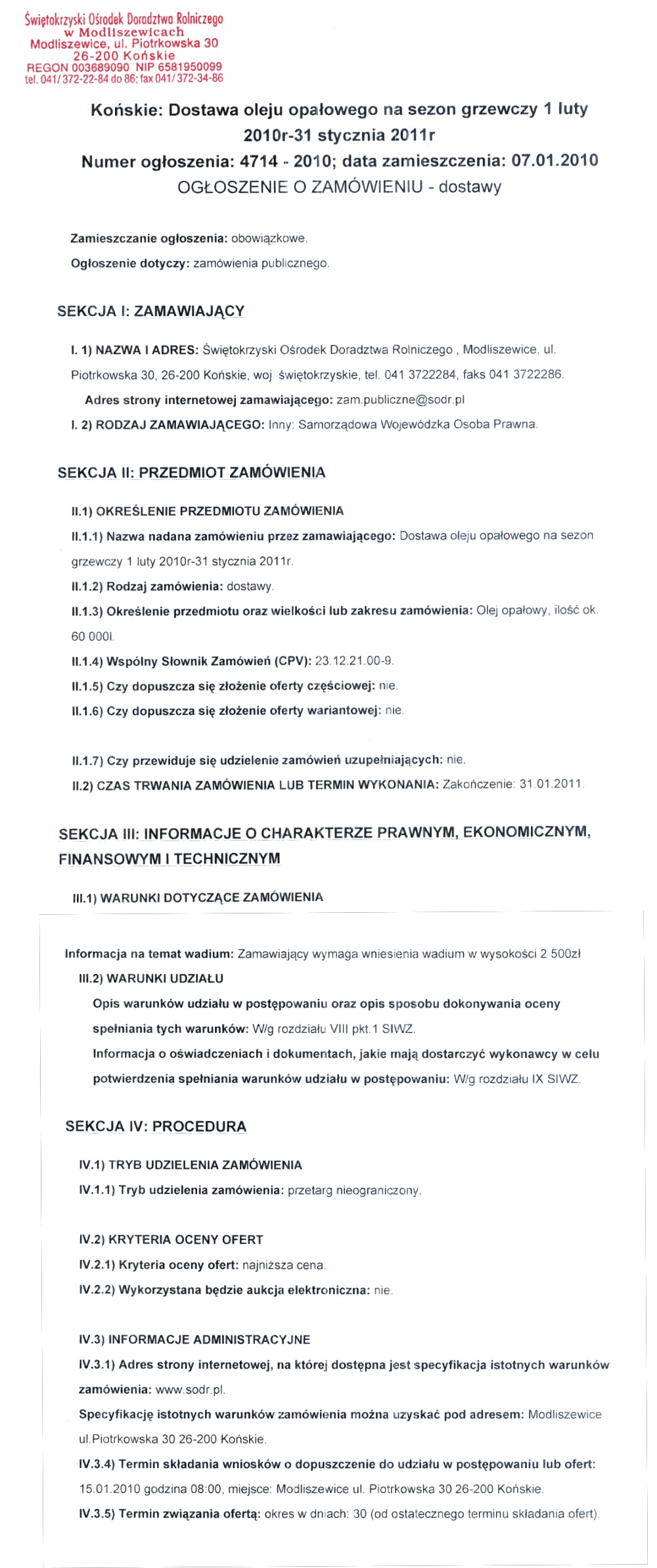 PRZETARG (TERMIN SKŁADANIA OFERT: miejsce: Świętokrzyski Ośrodek Doradztwa Rolniczego Modliszewice ul. Piotrkowska 30, pokój nr 13 Sekretariat Ośrodka, do dnia 15 stycznia 2010r godz. 8:00, Dostawa oleju opałowego do kotłowni Zamawiającego na sezon grzewczy 1 luty 2010r. - do 31 stycznia 2011r.
