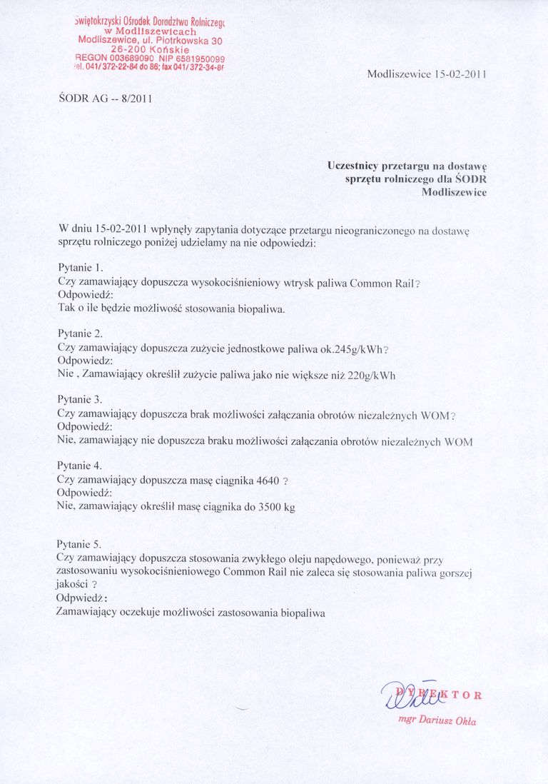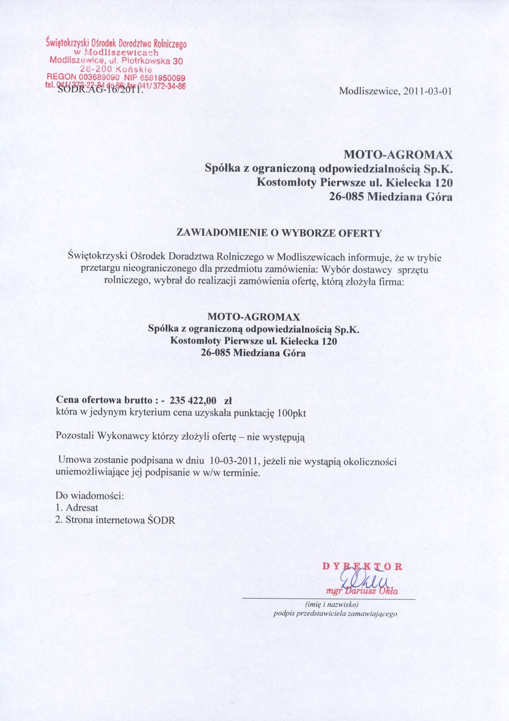 PRZETARG Oferty należy składać w siedzibie zamawiającego Świętokrzyski Ośrodek Doradztwa Rolniczego w Modliszewicach ulica: Piotrkowska 30 26-200 Końskie Pokój nr 13 – Sekretariat Ośrodka w Modliszewicach (pierwsze piętro Ośrodka), do dnia 13-01-2011, do godz. 14:00. OGŁOSZENIE O ZAMÓWIENIU - dostawa artykułów żywnościowych Załączniki: