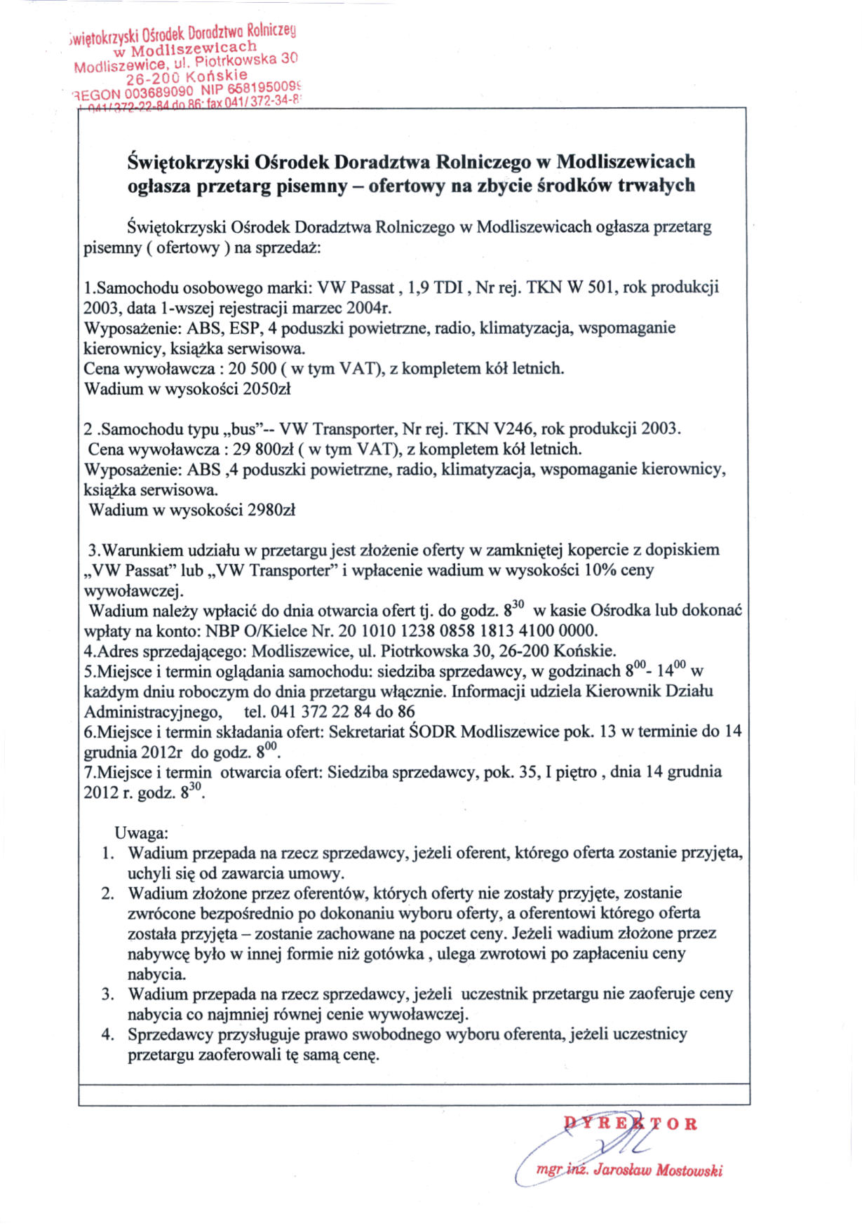 PRZETARG Termin składania wniosków o dopuszczenie do udziału w postępowaniu lub ofert: 12.12.2012 godzina 08:00, miejsce: Świętokrzyski Ośrodek Doradztwa Rolniczego w Modliszewicach, Modliszewice ul. Piotrkowska 30 26-200 Końskie.