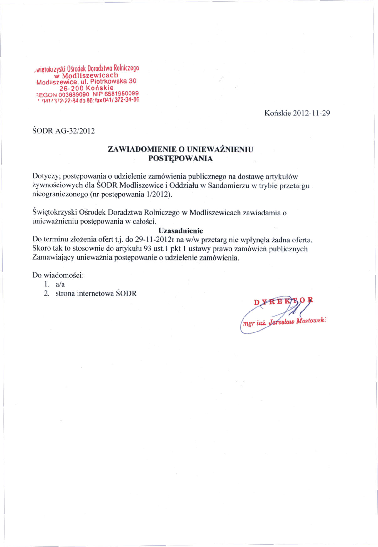 PRZETARG Termin składania wniosków o dopuszczenie do udziału w postępowaniu lub ofert: 29.11.2012 godzina 08:00, miejsce: Świętokrzyski Ośrodek Doradztwa Rolniczego w Modliszewicach, Modliszewice ul. Piotrkowska 30 26-200 Końskie.